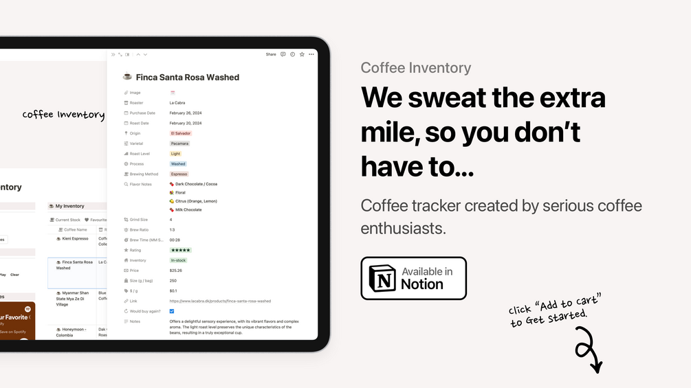 We've created this template to help you track all your favorite coffee beans at home, so you can effortlessly track your at-home inventory, manage your wishlist and be able to find your favorite coffee, while having a built-in Brew Timer, Spotify playlist and more to set the perfect vibe. ☕️